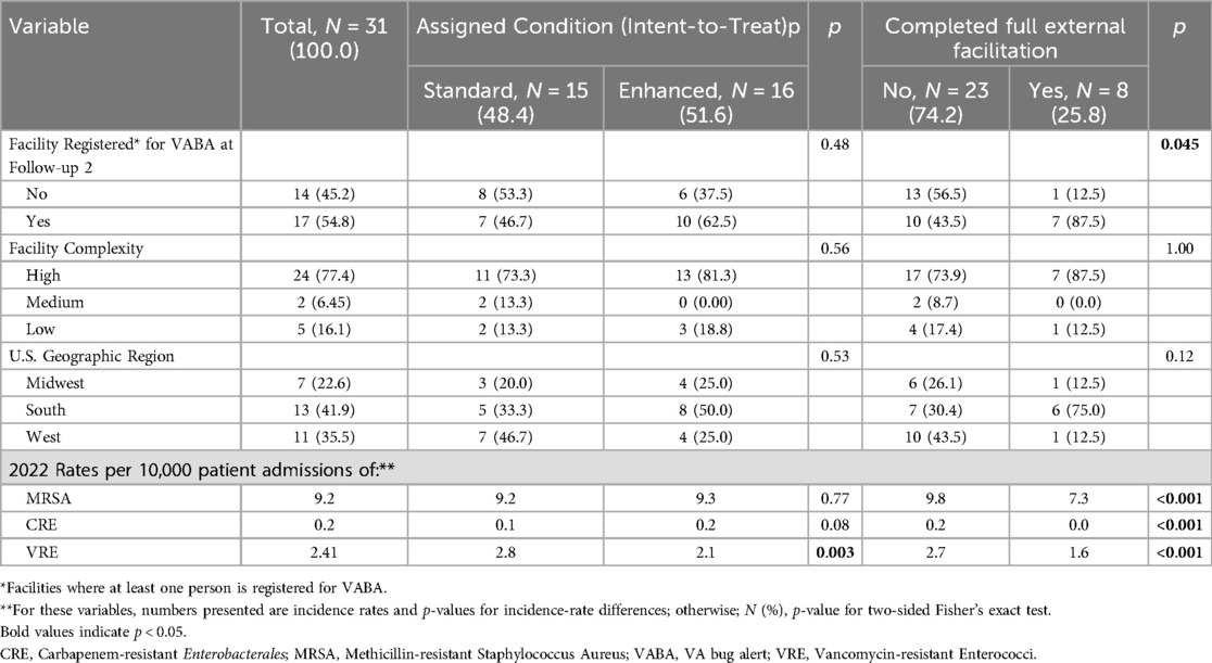 Table 3 displays facility characteristics and registration status at Follow-up 2 by assigned implementation condition of facilities (the intent-to-treat analysis) and whether they completed full external facilitation. There were no significant differences in facility complexity or geographic region by type of implementation assigned or received. However, VRE incidence rates per 10,000 patients were significantly higher among those assigned to standard implementation than enhanced implementation (p-value = 0.003). Furthermore, rates of CRE, VRE, and MRSA per 10,000 patients were significantly higher among the 23 facilities who did not complete full external facilitation (i.e., both participate in guided interviews and accepted coaching about VABA during said guided interviews) than the 8 who did (p-value < 0.001 for all).