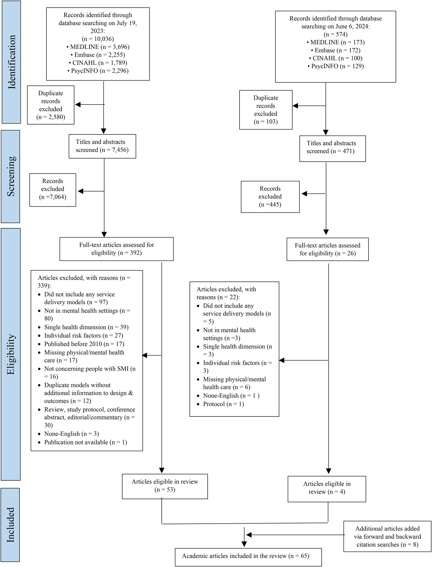The Substance Abuse and Mental Health Services Administration in the U.S. defines SMI as a diagnosable mental, behavioral, or emotional disorder that substantially interferes with a person's life and ability to function (7). Articles were eligible for this scoping review if: [1] the population of interest included individuals over the age of 18 living with SMI, such as bipolar disorder, treatment refractory depression or schizophrenia, with no other demographic constraints; the age cutoff of 18 was selected to focus on the adult population, as mental health needs and treatment approaches can differ between adults and minors (64); [2] articles focused on the concept of reverse integration, defined as the provision of physical health care services within mental health settings to address physical health needs and prevent physical health decline (40, 65); [3] they were published as peer-reviewed academic journal articles and book chapters; [4] they were published between January 1, 2010 and June 6, 2024, to capture the most recent studies and reflect evolving practices and developments in the field over the past decade; and [5] they were written in English language. There were no methodological restrictions on article eligibility.