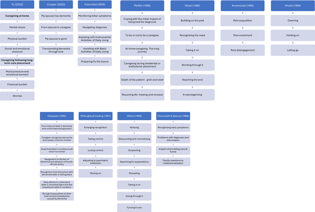 A schematic of the caregiving stages from each study is presented in Figure 2. The models progress in a sequential manner and share several common features in the progression of stages: beginning with the recognition of dementia symptoms, followed by diagnosis, acceptance of the need for care and support, adaptation to and management of dementia, balancing caregiving responsibilities, transition to residential care, and culminating in rebuilding life following the death of the person with dementia. While dementia symptoms may manifest and be experienced in different ways, the models tend to follow a pattern of escalating carer's responsibilities and growing dependency as dementia advances.