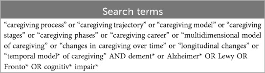 The search was initially conducted in January 2023 as part of a PhD project and rerun in July 2025. Four health sciences databases were searched: Applied Social Sciences Index and Abstracts (ASSIA)(ProQuest); CINAHLPlus (Cumulative Index to Nursing and Allied Health Literature: EBSCO); MEDLINE (EBSCO), and APA PsycINFO (ProQuest). The publication date was set to start from 1986, reflecting the earliest publication by Chenoweth and Spencer (34) identifying stages in a caregiving career.