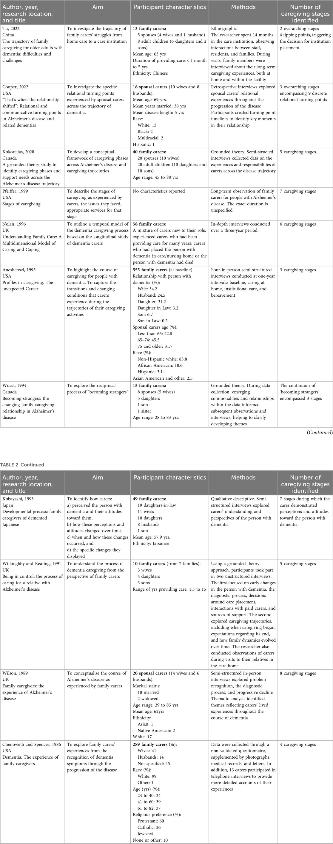 Data and study characteristics from articles that met the inclusion criteria following full-text screening were extracted into an Excel spreadsheet by a single reviewer (MC). The data extracted included the author, year, research location, title, study aim, sample characteristics, methods, and the number of caregiving stages.