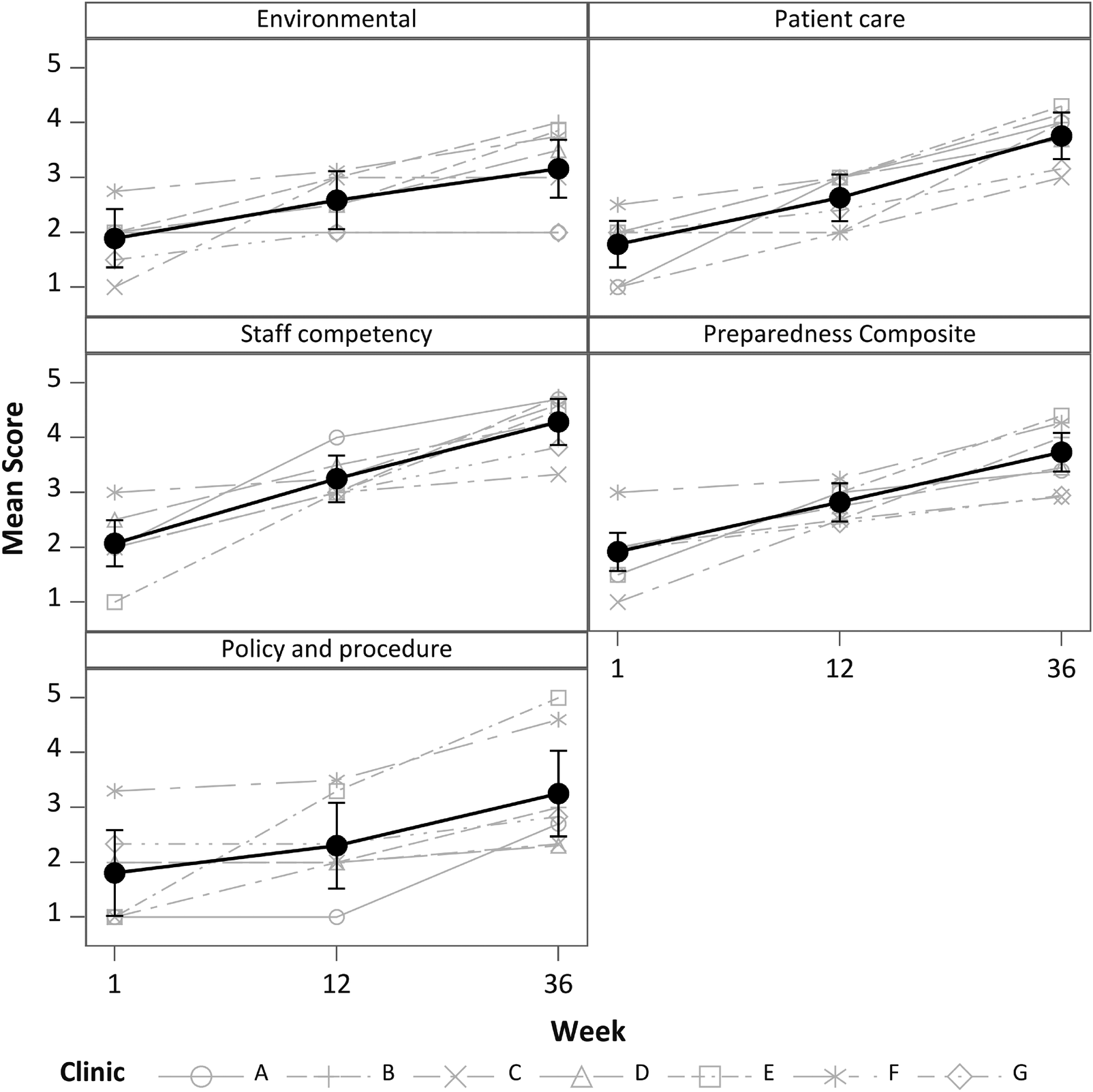 The Environmental Scan information and scoring were conducted independently by multiple ATTOC intervention consultants at each assessment time point, and individual findings were reviewed together to compare findings and determine a final version of the ES assessment and the scoring for each of the four areas. The four preparedness areas were scored on a range of 1–5, with a score of 5 marking excellence in preparedness. A table of anchoring points had been developed for this scoring purpose. The four individual scores were summed to provide an overall preparedness score. The findings and scoring were reviewed with the local agency champion and leaders after each ES was completed. In addition, an overall composite preparedness score was calculated by averaging the environmental preparedness score, the patient preparedness score, and the staff competency preparedness score. These three ES scores were significantly correlated (Pearson correlation >0.65 for all) with a standardized Cronbach's α = 0.89. We hypothesized that this composite measure can be used to model the association between preparedness and patient referrals during the study.