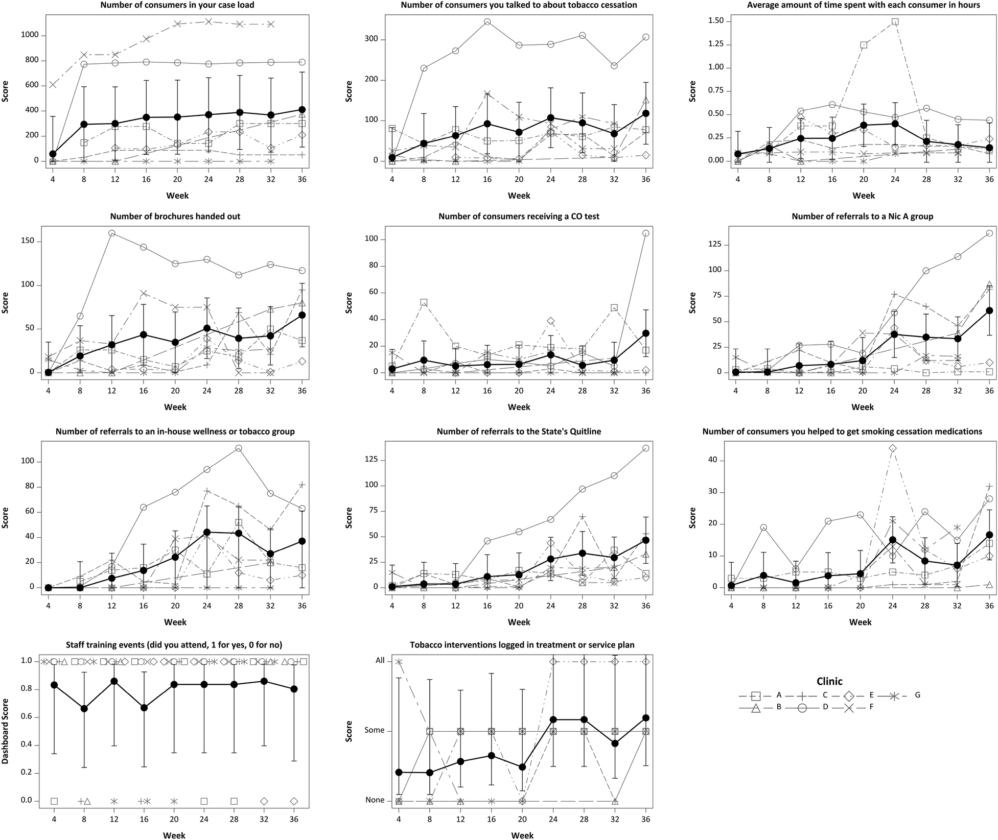 The ATTOC Dashboard is a one-page summary of the agency clinician behaviors related to the implementation of 11 TUD patient activities, documentation, and staff training. This monthly assessment is based on staff self-reports and chart reviews. The dashboard aggregated individual clinician data and summarized information such as patient caseload number, average amount of time spent with each patient and time spent on tobacco discussion, and the number of patients who received an educational brochure, undwerwent a CO test, and/or were referred to a Nic A group, an in-house wellness or tobacco group, state's quitline, or for TUD medications. Documentation of TUD and attendance at staff training were also assessed. Table 3 summarizes this information. A composite variable to represent patient care activities was created by averaging three items: the number of consumers spoken to about tobacco cessation, the number of brochures handed out, and the number of consumers who received a CO test. Variables in the composite activity measure were significantly correlated p < 0.03 (Pearson correlations between 0.89 and 0.31) and had a standardized Cronbach's α = 0.76. A composite referrals variable was computed by averaging four dashboard items: number of referrals to a Nic A group, number of referrals to an in-house wellness or tobacco group, number of referrals to the state's quitline, and number of consumers assisted in obtaining smoking cessation medications (Table 3). The composite referral variable had a standardized Cronbach's α = 0.89 with Pearson correlations among variables ≥0.47 and p < 0.001.