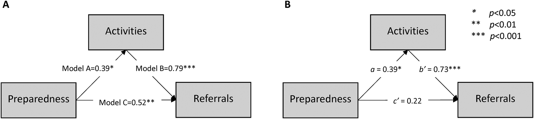 In this report, we examine the changes at the organizational level following the implementation of the ATTOC model within community mental health agencies to address TUD patients. We hypothesized that implementation indicators collected via the ATTOC Environmental Scan (ES) and the ATTOC Dashboard would increase over time. We next hypothesized that combined environmental, staff, and patient preparedness for the intervention and TUD patient activities are potential mechanistic pathways that would be positively associated with increases in patient referrals. We also investigate whether preparedness is associated with improvement in the number of activities and estimate the combined direct and indirect impact on referrals.