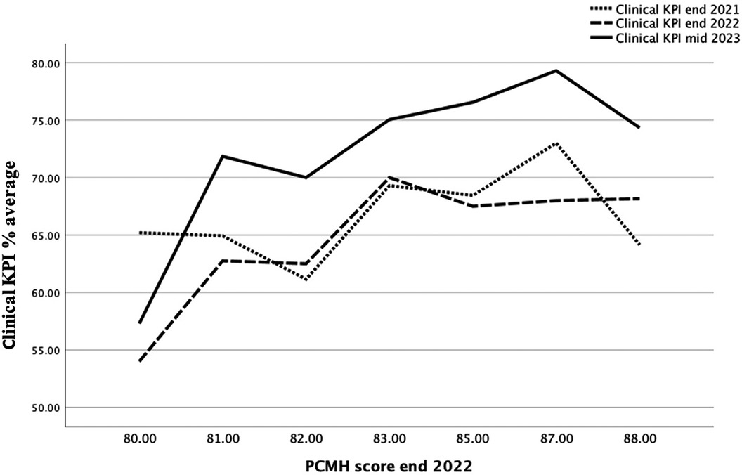 Figure 2. Clinical KPI average of all centers in relation to NCQA PCMH scores at the end of 2021, end of 2022, and mid-2023.
