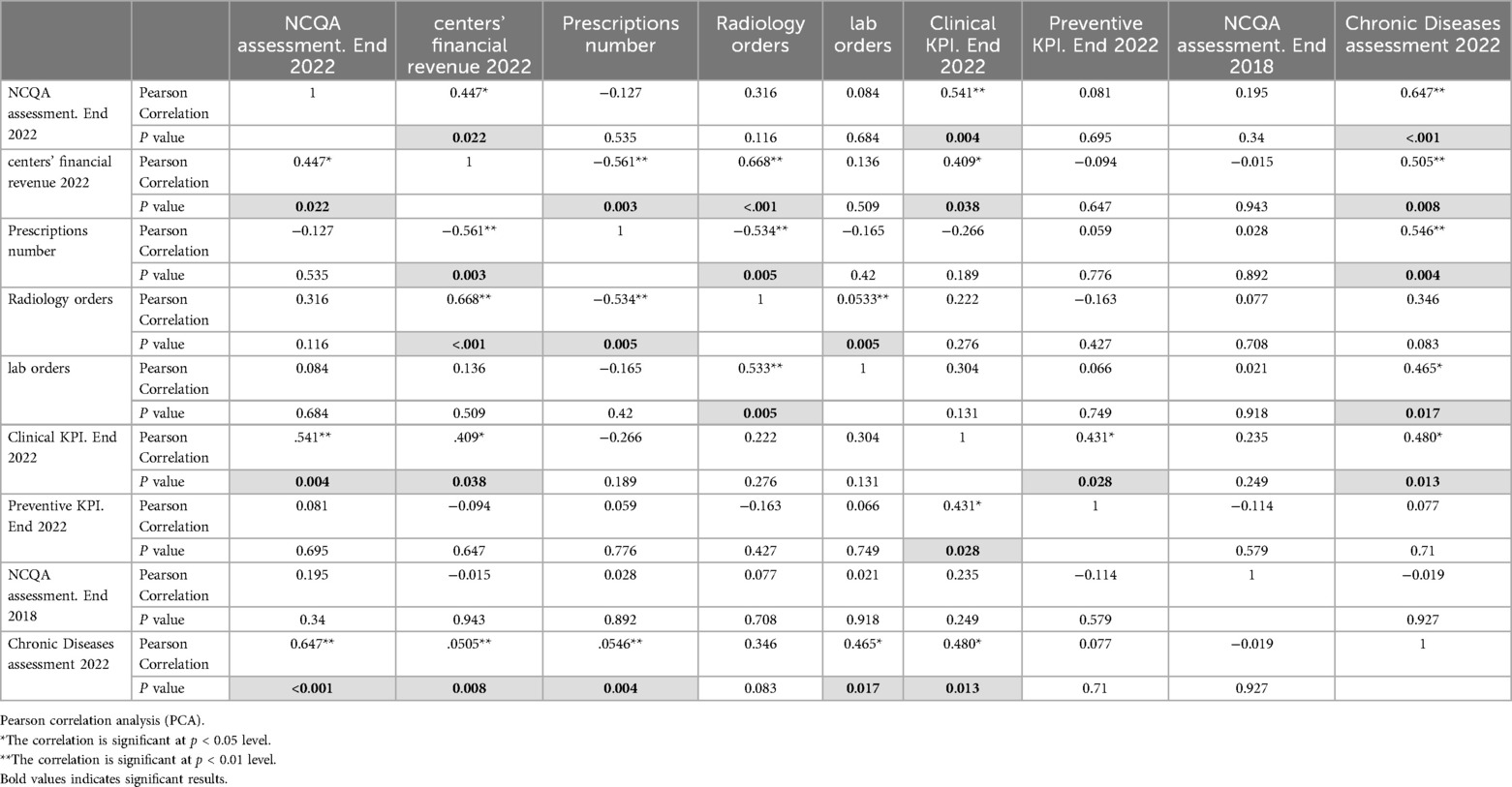 KPI and audit data were summarized, graphed, analyzed, and reported using Microsoft Excel® (Microsoft, Redmond, WA) and SPSS Version 29. Descriptive statistics, frequency, and the percentage of adherence to PCMH and CDC standards were calculated. Univariate and multivariate linear regressions were employed to assess the association between the performance outcomes related to the KPI and the PCMH and CDC scores. The multivariable model was adjusted for variables such as financial performance, city, and being a rural center. Pearson correlation analysis (PCA) was employed to assess the correlation of PCMH and CDC scores with other important variables, such as the centers' financial revenue, laboratory imaging, and pharmacy orders, and a linear mixed-effects model was used to account for center-level clustering. Statistical significance was set at p < 0.05.