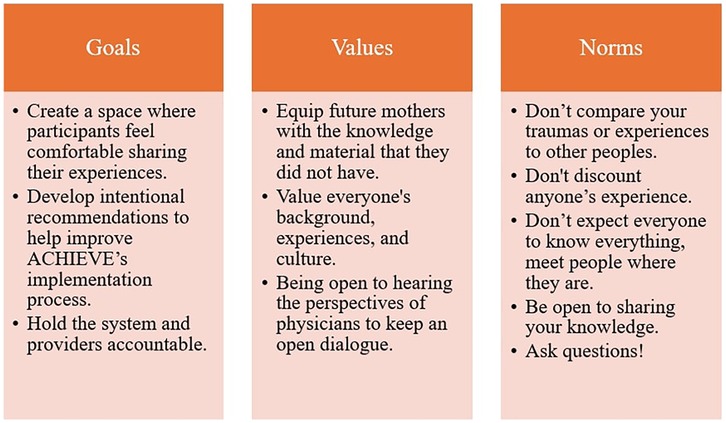 The solution proposed was to utilize the “Build a workgroup” implementation strategy (13). This complements our strategy to build a coalition because it increases the diversity of perspectives and individuals contributing, reviewing, and disseminating the work. ACHIEVE's version of a workgroup was to establish a safe, supportive, community-driven space to share birth experiences and provide crucial guidance to the research.