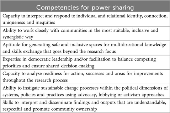 24. Ozano K, Alam W, Aktar B, Okoth L, Chumo I, Quach JA, et al. Seven core competencies and conditions for equitable partnerships and power sharing in community-based participatory research. BMJ Glob Health [Internet]. (2024) 9(11):e015497. doi: 10.1136/bmjgh-2024-015497