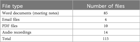 Two members of the UC San Diego research team organized study documents (N = 115) chronologically, including meeting minutes, action items, email chains, and audio recordings from the start of grant preparation to the launch of recruitment (see Table 1). Files dated back to November 2020, prior to grant submission; receipt of funding began in September 2021; and study launch was in January 2023. A reflexive approach in which researchers consider how their views and feelings have influenced findings was employed for coding notes and documents. This approach allows researchers to uncover “unexpected meanings rather than summarize the data [and] are interpreted through researcher's assumptions, commitments, and scholarly knowledge” (13). This coding process leads to a synthesis of themes reflecting patterns of shared meaning and understanding, which are explicitly embedded in the social context where the work was done. Thus, it is not meant to be an “objective” analysis but, instead, is guided toward reviewing with purpose and context to understand and reflect on dynamic issues of power and decision-making. The research team reviewed codes and developed a table to summarize qualitative themes that emerged from code review (Table 2).