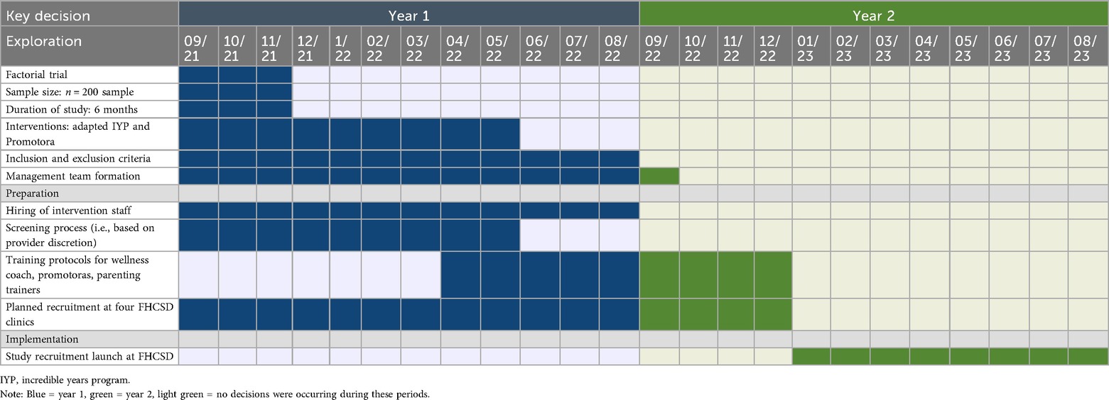 The research team reviewed the chronologically organized study documents to develop a timeline demarcating key events and decisions made during the first and second years (Table 2). The timeline was also used to compare the expected month of study launch (September 2021) with the actual study launch (January 2023).