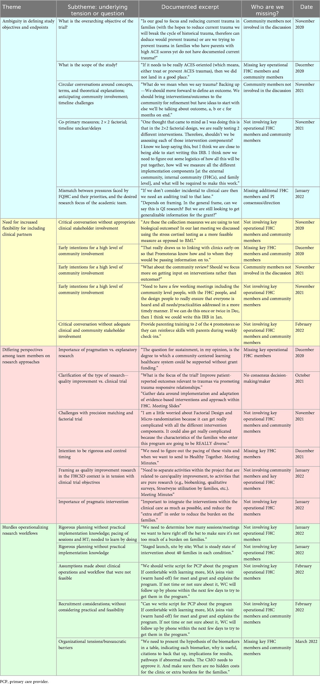 The theme “ambiguity in defining study objectives and endpoints” involved notable subthemes: (1) redundant discussions around objectives, aims, frameworks, samples, and outcomes; (2) reconsideration of primary outcomes; and (3) establishing the scope of the research. For example, one team member in November 2021 encouraged the team to redefine terminology and clarify outcomes, “What do we mean when we say trauma? Backing up—We should move forward to define an outcome. We should bring interventions/outcomes to the community for refinement but have ideas to start with or else we’ll be talking about outcome, a, b or c for months on end.” Team documentation also revealed an order of operations that was often repetitious. The omnipresent influence of timelines required for the clinical trial and complexities of managing budgets challenged the team's efficiency, especially when the protocol, measures, and processes were often in flux. For example, the team held conversations to finalize training processes for personnel ahead of finalizing intervention components.