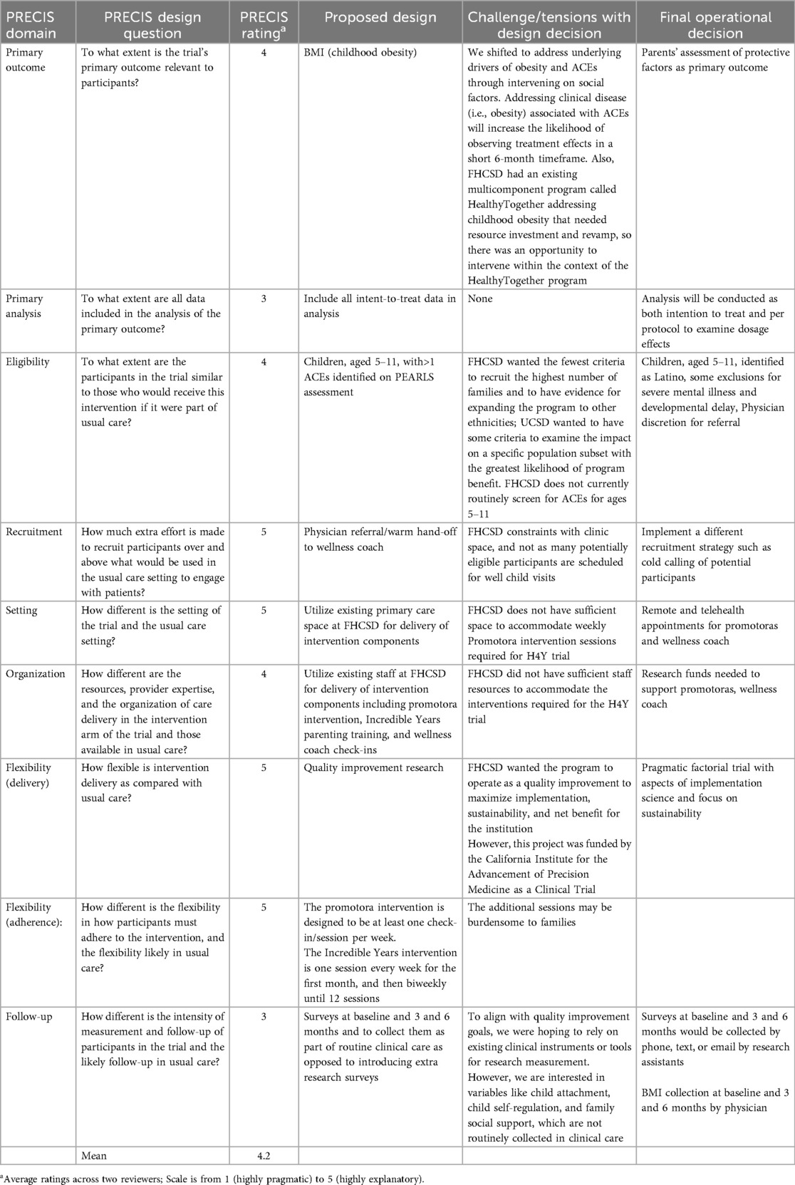 Two academic researcher team members independently rated the HEALthy4You study on each methods domain of the PRECIS model (14, 15), as presented in Table 3. The PRECIS-2 is a framework used by trialists to assess where their clinical trial design sits on the spectrum between a purely pragmatic approach (real-world effectiveness) and a purely explanatory approach (testing a mechanism under ideal conditions). The tool helped to evaluate where the study fell on the pragmatic–explanatory continuum and contextualize tensions identified through the document review. Each PRECIS domain (outcome, analysis, eligibility, etc.) includes a question to facilitate rating. For example, for the domain of primary outcome, the prompt is, “To what extent is the trial's primary outcome relevant to participants?”. The rating scale ranges from 1 very explanatory, 2 rather explanatory, 3 equally pragmatic–explanatory, 4 rather pragmatic, to 5 very pragmatic. Table 4 presents the average ratings of the two reviewers.