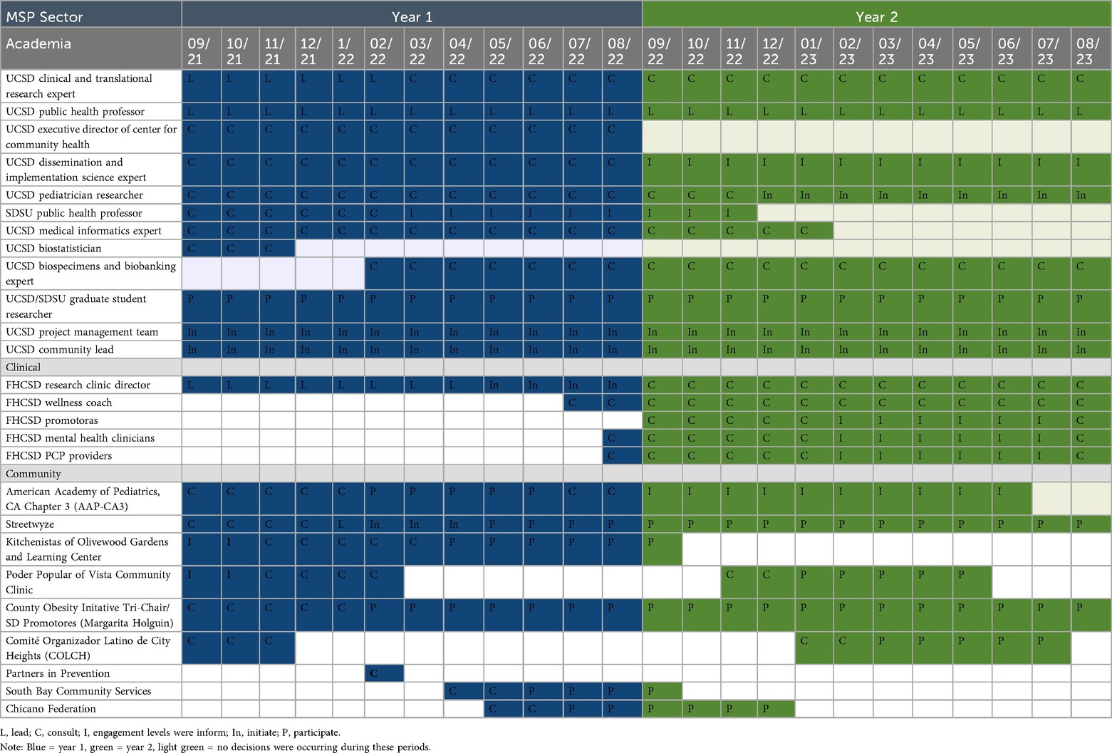 To systematically document stakeholder engagement during the HEALthy4You startup phase, we developed the HEALthy4You Timeline of Team Engagement in Table 5. The table charts stakeholder involvement across academic, clinical, and community sectors during the 24-month startup phase, mapping engagement levels using the “Spectrum of Public Participation” (16). Engagement levels were inform (I), consult (C), participate (P), initiate (In), and lead (L), representing increasing levels of influence on decision-making processes. Research assistants reviewed team notes, meeting agendas, and participant attendee lists to categorize team member engagement in team decision-making. The table was reviewed and discussed by the co-authors.