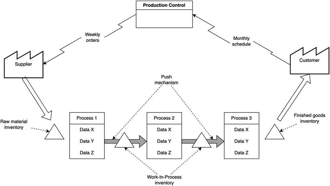 Figure 1 depicts a current VSM of a conceptual production line that adopts the push philosophy. Under such a philosophy, materials are pushed from one manufacturing process to another. A brief explanation of Figure 1 will be given here but the interested reader is referred to Rother and Shook (5) for further description. First and foremost, the customer is drawn in the right-side part of Figure 1. Customers in the manufacturing industry are not necessarily individuals, they can also be organizations, as in the case of wholesalers buying from manufacturers. In such cases, value can be achieved by meeting specific product requirements that are set by customers. On the left-side part of Figure 1, the supplier is regularly delivering raw materials to the production line, where they are stocked for a certain period. These materials then are transformed through a series of manufacturing processes that convert them into work-in-process semi-finished products, and finally, into finished goods. Customers' requirements, therefore, are met through the capability of production processes to transform raw materials into finished goods with acceptable quality standards. Each production line has its production control unit, typically using Materials Requirements Planning (MRP) or Enterprise Resource Planning (ERP) systems. Through such a system, the factory (i.e., manufacturing firm) receives monthly forecasts from customers and, using the same system, sends weekly orders to suppliers. The same system is also employed for production schedule across the various processes.