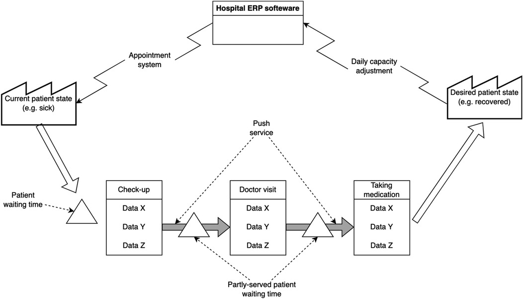 In healthcare, as shown in Figure 2, the patient is first transformed from one state to another and then asked if they accept the outcome. In other words, a patient's psychological/physiological state in healthcare can be compared to the raw materials in the manufacturing industry, where various processes transform the patient from an undesirable state to a more desirable state. The notion that the patient is both a transformed entity, as well as a customer, makes implementing lean thinking in healthcare rather challenging. Inventory in healthcare takes another form. This form is manifested in the waiting time of patients before each activity (e.g., the check-up or the actual doctor visit). Waiting time therefore can be classified into pre-waiting time, semi-waiting time and served patient waiting time. The ERP system in healthcare schedules activities by continuously adjusting capacities (e.g., doctors' availability) and scheduling appointments for patients.