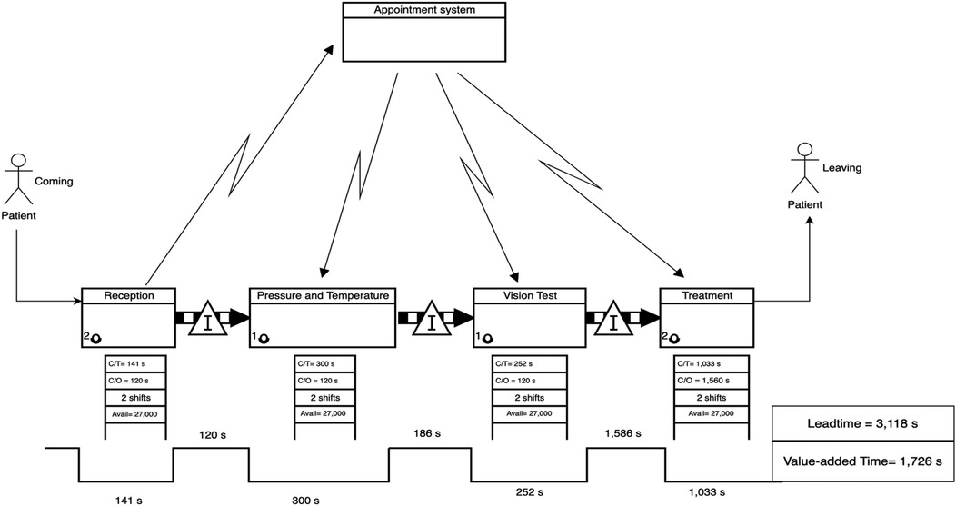 The current-state VSM for the ophthalmology clinic (Figure 3) revealed significant fragmentation in the patient flow and substantial waiting times between service stages. Specifically, the longest delays were observed before the final treatment stage, with a waiting time of 1,586 s (26.44 min), accounting for more than 40% of the patient's total journey.