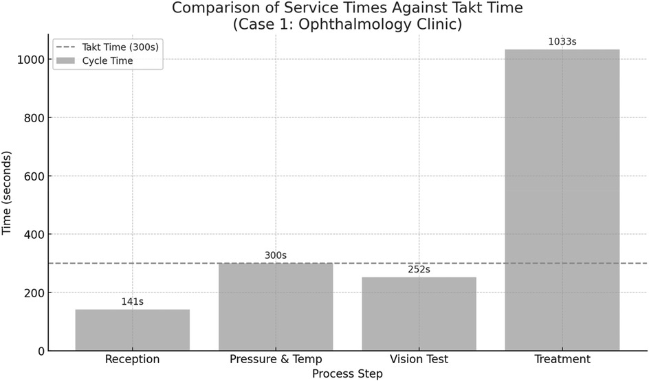 This benchmark was used to evaluate whether individual process steps exceeded the takt time threshold, indicating potential bottlenecks and targets for improvement in the future-state value stream. Figure 4 below illustrates the comparison between the cycle times of individual process steps in the ophthalmology clinic (Case 1) and the calculated takt time of 300 s per patient. The takt time represents the maximum allowable time to complete each patient interaction in order to meet daily service demand. As shown in the chart, the treatment stage significantly exceeds the takt time, indicating a critical bottleneck in the current workflow. In contrast, other stages such as reception, vision testing, and vital signs measurement fall within or near the takt time threshold. This visualization highlights the imbalance in the current process and underscores the need for redistributing or restructuring activities, particularly in the treatment phase, to achieve smoother flow and better alignment with patient demand.