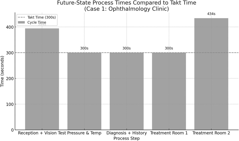 The future-state VSM was then developed based on an analysis of bottlenecks identified in the current-state process, with the goal of aligning all process steps as closely as possible to the calculated takt time of 300 s. The treatment stage in the current state was identified as the most time-consuming and resource-intensive step, significantly exceeding the takt threshold. To address this imbalance, the treatment stage was decomposed into three discrete subprocesses, each allocated to a separate treatment room. This restructuring allowed workload to be distributed more evenly across staff and space, reducing delays and supporting parallel processing. Additionally, the reception and vision test, which were previously sequential, were merged into a single step to reduce overall handoff time and eliminate redundant administrative interactions. Minor adjustments were also made to diagnostic and patient history collection tasks, allowing them to be completed concurrently with initial examinations. These changes resulted in a more balanced flow where most processes now operate at or near takt time, as shown in Figure 5. While two steps “reception + vision test” (394 s) and “treatment room 2” (434 s), remain slightly above takt time, the overall structure is significantly more synchronized, reducing patient wait time and improving throughput efficiency. Figure 6 presents the future-state process times for the ophthalmology clinic, illustrating how each redesigned step aligns with the takt time to balance patient flow and reduce inefficiencies.