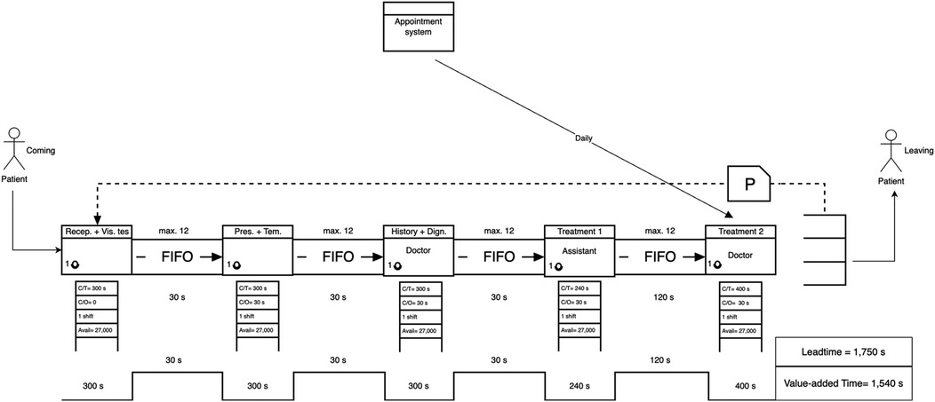 Lean thinking, initially developed for manufacturing (1, 11–14), has been increasingly applied in healthcare to enhance operational performance without compromising care quality. Its foundational principles: value, value stream, flow, pull, and perfection are particularly relevant in outpatient settings. Value refers to services perceived as beneficial by the patient, emphasizing outcomes such as reduced wait times and seamless care. Mapping the value stream enables the identification of all activities contributing to or detracting from that value, such as redundant paperwork or uncoordinated handoffs. Achieving flow in patient movement, by minimizing bottlenecks or unnecessary delays, has been shown to reduce Leadtime (i.e., defined as the total elapsed time from patient check-in to discharge) by up to 70% in similar interventions (7). The pull principle ensures resources are allocated based on actual demand rather than forecasts, for example through on-demand appointment slots. Finally, the pursuit of perfection drives continuous improvement by iteratively refining workflows based on stakeholder feedback and performance metrics. In combination, these principles offer a structured framework for redesigning healthcare delivery.