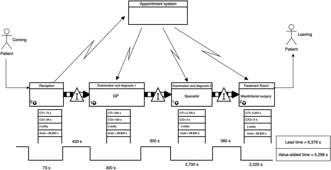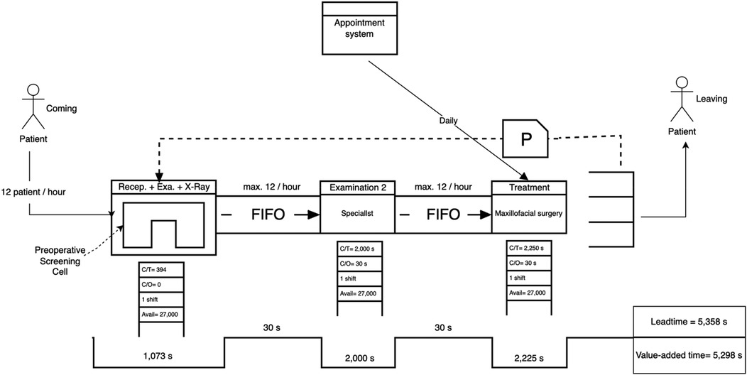 In the future-state VSM (Figure 10), lean restructuring included separating dental x-rays from the main diagnostic phase and establishing a pre-appointment triage system. This allowed for better resource allocation and more precise scheduling.