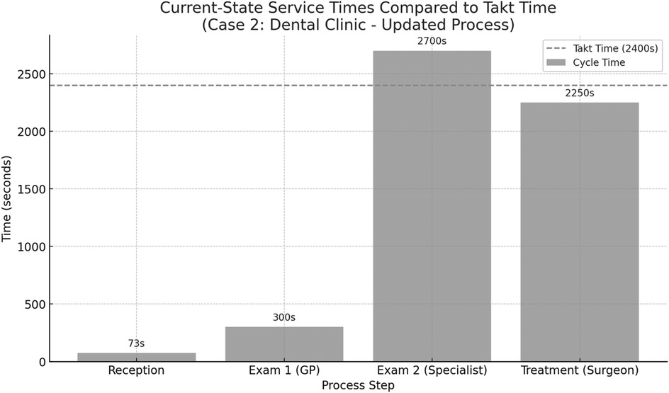 Figure 8. Comparison between the cycle times of individual process steps in the dental clinic (case 2) and the calculated takt time of 2,400 s per patient.