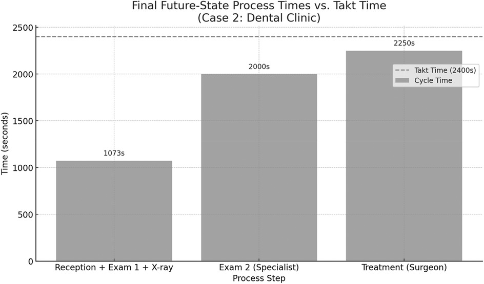 Figure 9 displays the final future-state process times after reconfiguring patient flow in the dental clinic. The first process, comprising reception, general practitioner screening, and x-ray, has been consolidated into a single step totaling 1,073 s, streamlining the entry pathway and reducing fragmentation. The subsequent steps, specialist examination (2,000 s) and treatment by the maxillofacial surgeon (2,250 s), both remain within the takt time threshold of 2,400 s. This restructured design achieves better load balancing across the patient journey while eliminating unnecessary delays and idle time between services.
