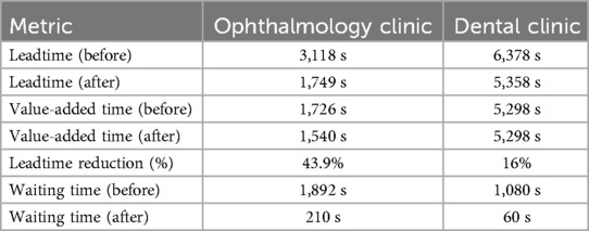 Table 1. Comparative summary of key performance metrics before and after future-state implementation in both the ophthalmology and dental clinics.
