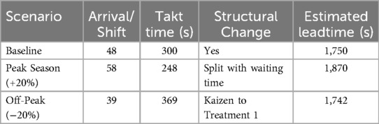 A sensitivity analysis was conducted to evaluate the robustness of the proposed VSM adaptation under variations in patient demand within the ophthalmic clinic (Table 2). Three scenarios were modeled: baseline, peak, and off-peak. In the baseline scenario (48 patients/shift), the system achieved a takt time of 300 s, with sequential execution of reception, diagnosis, and treatment stages. Minor waiting periods remained, leading to an estimated total leadtime of 1,750 s. During the peak season (+20% arrivals, 58 patients/shift), the takt time decreased to 248 s. This shift required splitting multiple processes, especially diagnostic and treatment stages, and reorganizing patient flow, resulting in an increased leadtime of 1,870 s. While throughput improved, added complexity contributed to buffer accumulation. In contrast, the off-peak scenario (39 patients/shift) yielded a longer takt time of 369 s. This allowed for merging or restructuring processes, including a potential kaizen improvement in Treatment 1. These adjustments shortened waiting time and brought the leadtime down to 1,742 s. This analysis affirms the adaptability of the proposed lean model under varying load conditions and provides actionable insights for clinic managers to proactively restructure workflows in response to demand fluctuations.