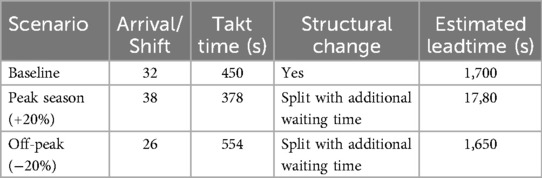 Table 2. Sensitivity analysis of the ophthalmic clinic process: leadtime variability under different arrival scenarios and corresponding structural adjustments.