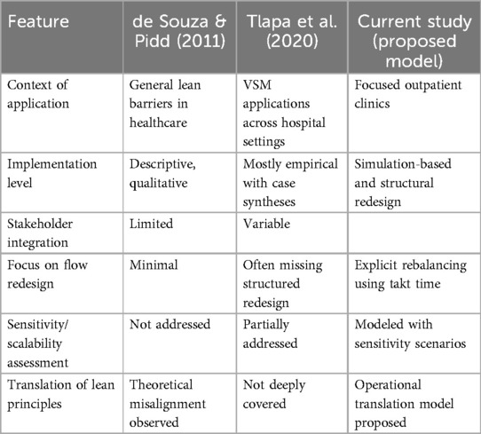 Table 4. Comparative analysis of the proposed VSM translation model and selected prior frameworks. The table highlights key distinctions in context, methodological rigor, stakeholder involvement, and adaptability to operational variability, emphasizing the novel contributions of this study in outpatient clinic settings.