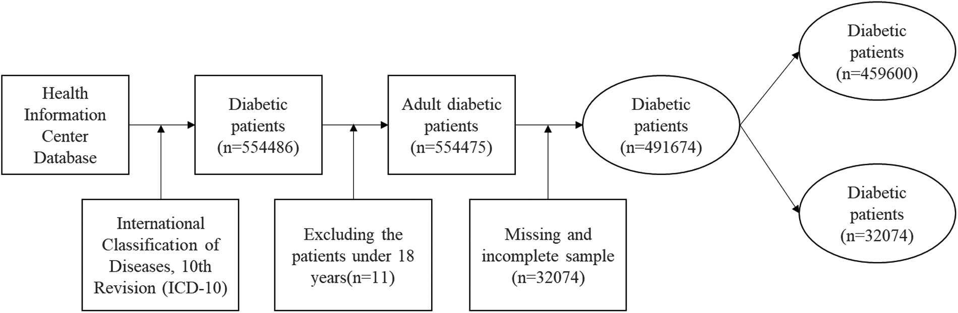 We retrieved annual patient records from January 1, 2014, to December 31, 2021, yielding up to eight observations per patient. A total of 554,486 diabetic patients were identified. After excluding patients under 18 years and cases with missing data (n = 62,801), the final sample included 491,674 patients: 459,600 contracted and 32,074 non-contracted. Inclusion criteria include: (1) Patients diagnosed with diabetes according to ICD-10; (2) Patients aged 18 years or older with diabetes; (3) Complete baseline data; (4) Complete health service utilization data (number of outpatient and inpatient visits). Exclusion criteria include: (1) Baseline data with >20% missing values for key variables (e.g., BMI, smoking status, blood pressure values, etc.); (2) Patients aged under 18 years with diabetes; (3) Duplicate data exported from the system; (4) Patients with incomplete healthcare utilization data; (5) Patients who were lost to follow-up during the follow-up period. This study restricted the research sample according to the following criteria (Figure 1):
