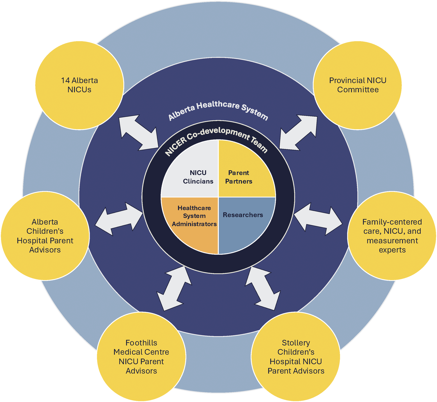 One of the most salient aspects of the co-development process was the conscious dedication of time and dialogue to operationalize how the team would share leadership and decision-making. A shared governance structure was created to promote shared decision-making, collective accountability, and shared responsibility by configuring the relationships between individuals and groups involved in co-developing the NICER Instrument (Figure 1). At the center, key perspectives of research team members are equally weighted in four quadrants to reflect the shared power and decision-making inherent to our team's values and processes. All members share leadership and responsibility for decisions regarding design, data collection, analysis, and knowledge translation. Outer circles represent additional groups of key collaborators involved in the co-development process. Finally, the entire governance structure is situated within Alberta's healthcare system, demonstrating our team's embedded position and the potential impact of contextual factors.