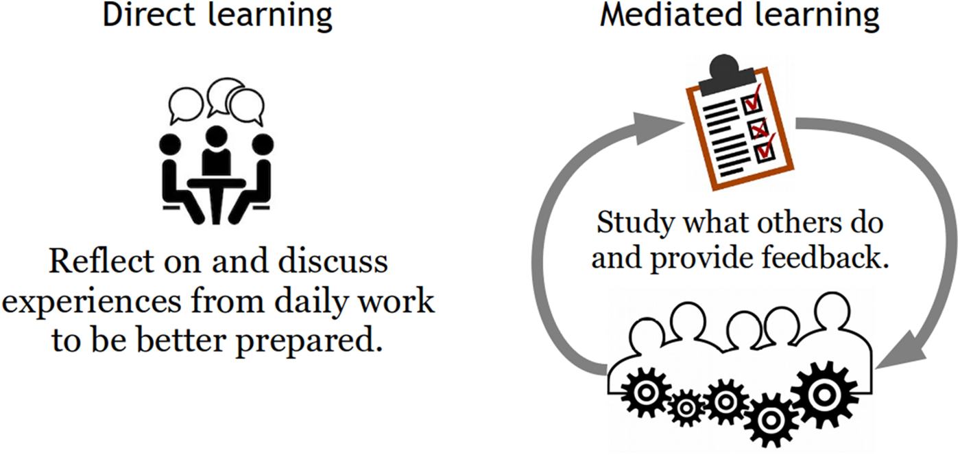 Direct learning occurs when individuals can discuss and reflect on their daily work, preferably when they still have good recall of it. By contrast, organizational learning is mediated in the sense that it is brought about by someone else, as shown in Figure 1. Cross-learning among clinical teams should be direct rather than mediated; people should learn directly from the situations they experience, rather than from how others analyze what was reported from their work. Learning should not be limited to what is conventionally reported, but reporting should be driven by the need of learning.