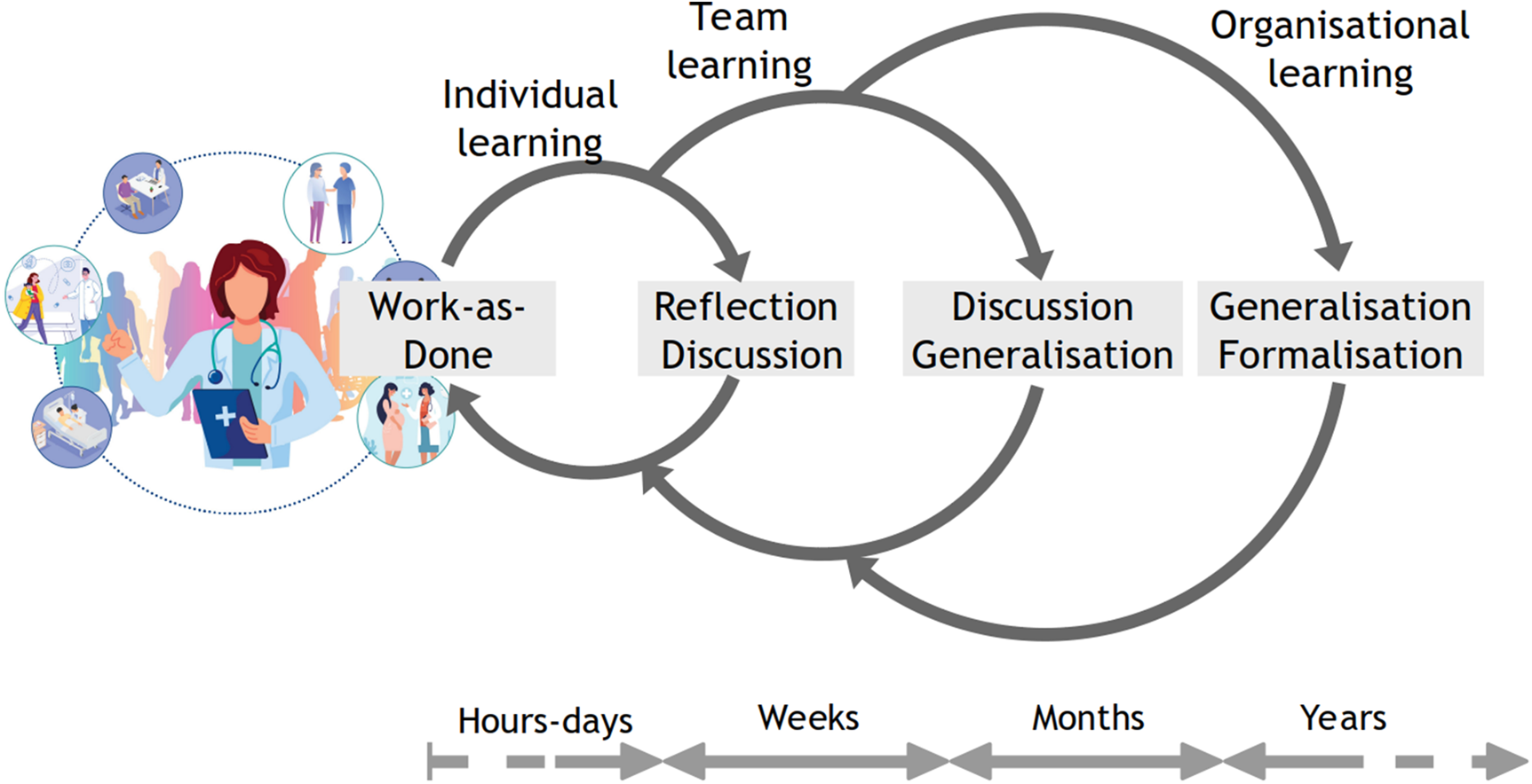 It is now widely accepted that resilient performance requires the potential to respond, the potential to monitor, the potential to learn, and the potential to anticipate (8). This study focuses on how people can learn from everyday work that usually goes well and leads to acceptable outcomes, rather than learning derived only from work that does not go well and leads to unacceptable outcomes (9). Learning is often traditionally indirect and mediated by a team of experts that observe or analyze the work of others and provide delayed feedback—the lessons learned—to the others, usually in terms of what should not be done. But learning can also be immediate and allow those who work at the sharp end to learn directly from what they do. This form of learning can be done whilst working with others who share their insights about Work-as-Done—that is how work is actually performed in practice, as opposed to how it is imagined or prescribed. Although this type of cross-learning—defined as informal, or peer-to-peer learning that occurs through shared reflections and everyday attractions, is essential in most work settings, staff shortages, established orthodoxy and unpredictable demands often limit opportunities for team debriefings and reflections (10, 11). Teams rarely discuss what has happened during their working days unless a critical incident has occurred. Although learning from incidents is important, it is limited to what went wrong or did not work (also known as Safety-I) and fails to pay attention to what has gone well and what worked (also known as Safety-II) (12–14). Understanding how systems and processes normally operate not only focuses on what actually happens when work goes well but also provides more robust contextual knowledge that enhances how people make sense of events when they occur. Work that goes well represents “an ongoing condition in which problems are momentarily under control due to compensating changes.” (15).