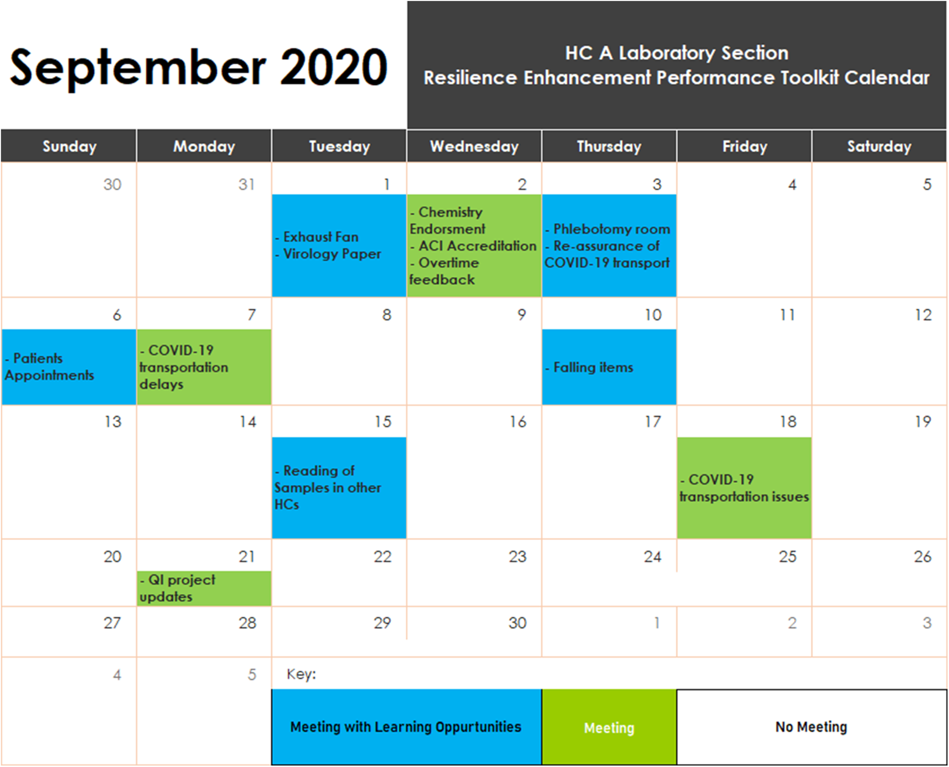 The duration of each RPET meeting was planned to not exceed 15 min. The teams were given the freedom to design an RPET calendar to meet their needs; however, all teams agreed upon a common color-coded icon to track meeting days, learning outcomes, and events. Green and white represent days with and without RPET meetings, respectively. The day of the meeting where learning takes place is represented in blue. A sample example of an RPET calendar from one of the HCs is shown in Figure 3 below.