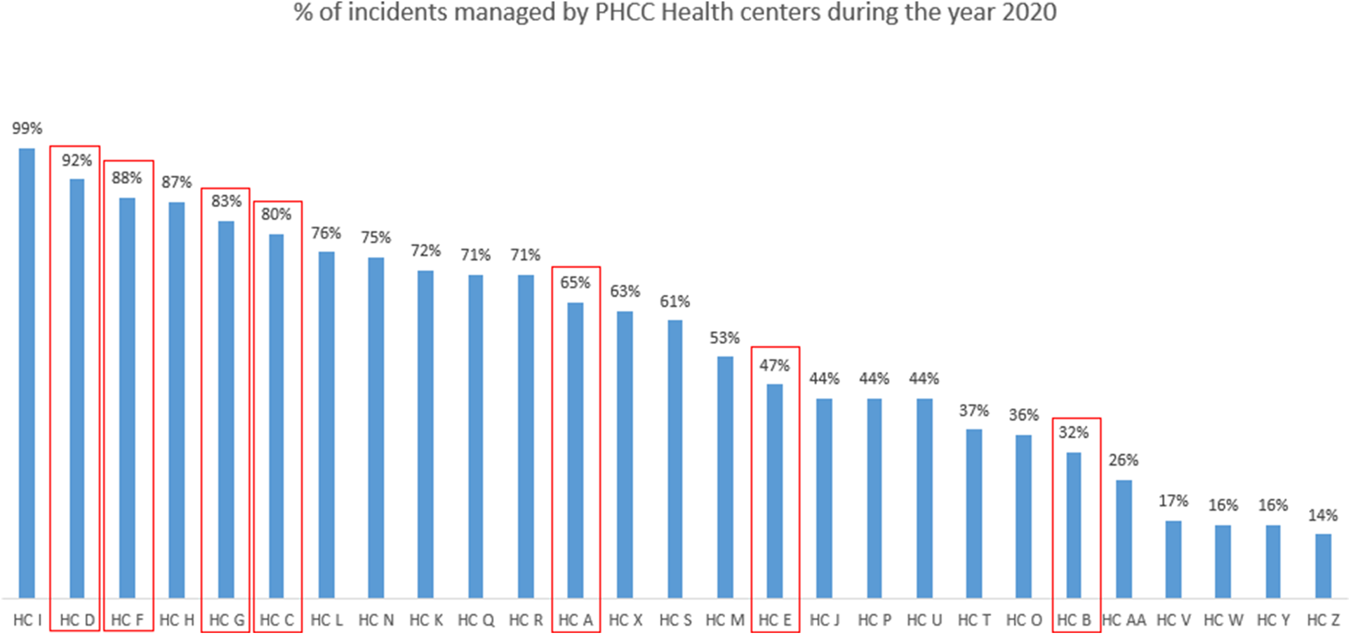 | Health Center (HC #) | #teams Implemented RPET | Teams Implemented RPET | # Teams in each HC | # Staff in each HC (Dec 2020) | #Patient population visiting each HC | #Patient Visits in 2020 for each HC | ||||||||