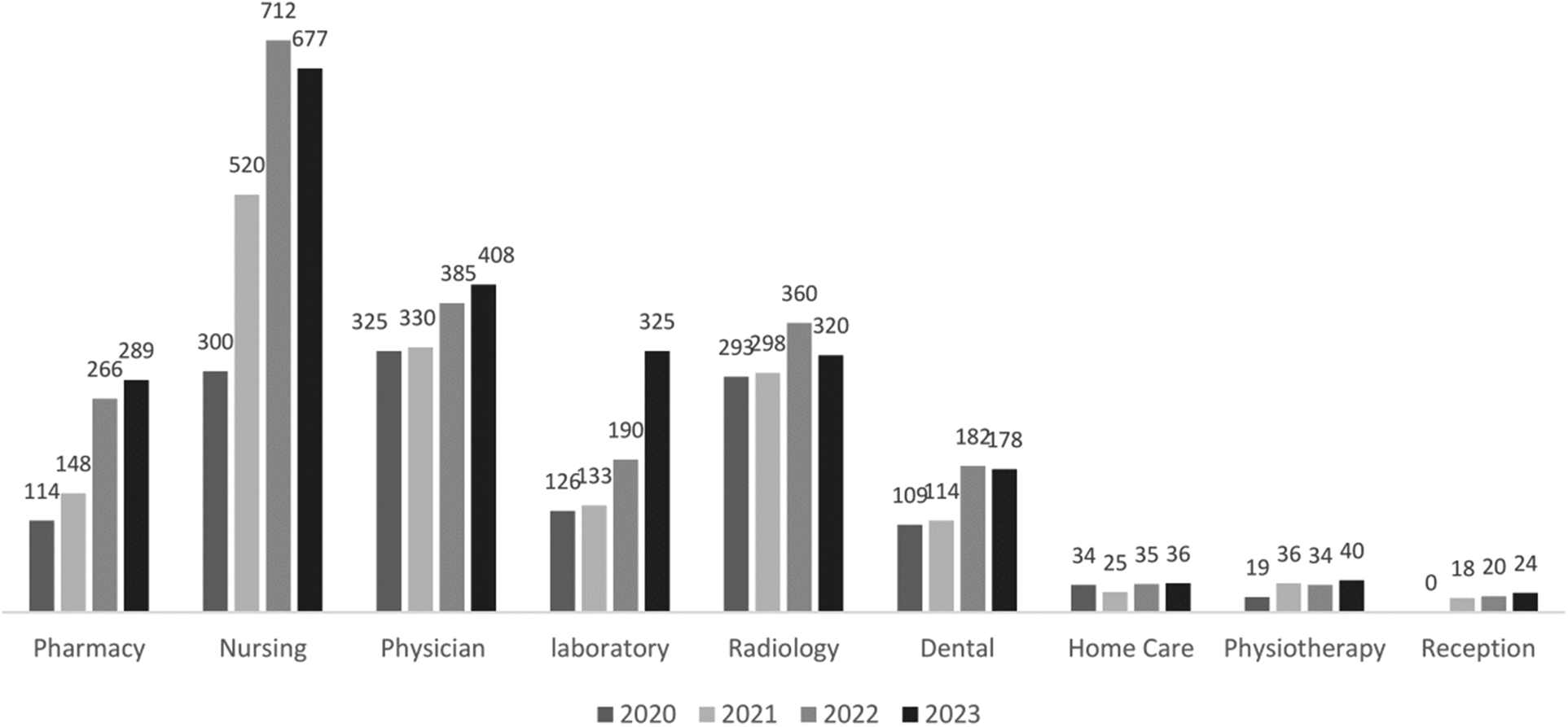 | Nursing | Physician | Pharmacy | Laboratory | Radiology | Dental | Physiotherapy | Admin | Home care | ||||||