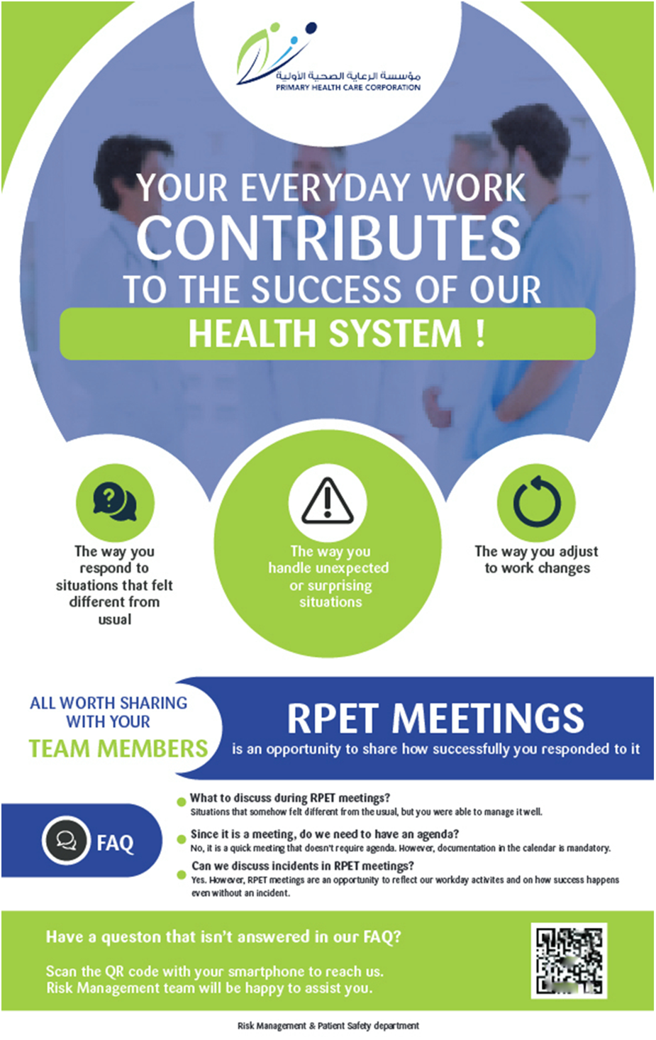 Phase-II training was conducted during the COVID-19 pandemic, using a virtual platform to accommodate all staff as part of the mandatory annual patient safety awareness session. This concept was introduced to ensure effective safety communications within teams. The training was approved for two continuing professional development (CPD) points for the attending clinical staff. The training consisted of a 40-min lecture, 20 min of questions, and a discussion. The difference between this training and Phase I training is that many of the staff had been participating in RPET meetings prior to Phase II training, which made the discussion more engaging, helped adjust the training material, and clarified key concepts. One of the key points clarified was the difference between an RPET meeting as a reflective meeting and operational meetings, such as monthly departmental meetings (with an agenda focused on the operational plan), huddles (focused on briefings related to daily operational priorities), and patient safety event meetings (focused on a given incident or trend of incidents).