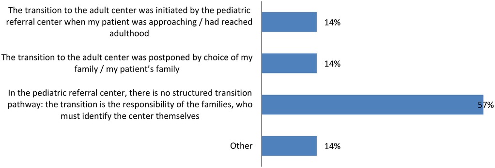 Regarding the transition to adult care centers, caregivers of DEEs/LGS patients report that this process begins at age 18 in 29% of cases. The remaining respondents describe highly variable situations, reflecting the lack of structured procedures: in 14% of cases, the transition occurs after the patient turns 20 or 25; in 7%, it occurs only when necessary; and in another 14%, the process is left entirely to the family, which has to find a suitable center on its own. A significant proportion of respondents do not know when the transition will occur, partly due to a lack of information, but also because they are caregivers of patients who have not yet reached the transition age. Among families currently being cared for by a pediatric center, 75% report that the topic is not discussed, primarily because the caregivers themselves prefer that their loved ones continue to receive care from the same facility.