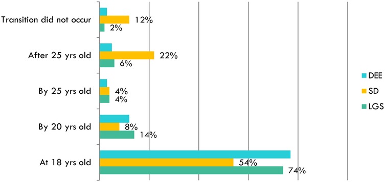 • Later transition to adult specialists for DS (DEEs/LGS: transition at 18 years in 74%–77% of cases, after 25 years in 5%–6%; DS: transition at 18 years in 54% of cases, after 25 years in 22%).