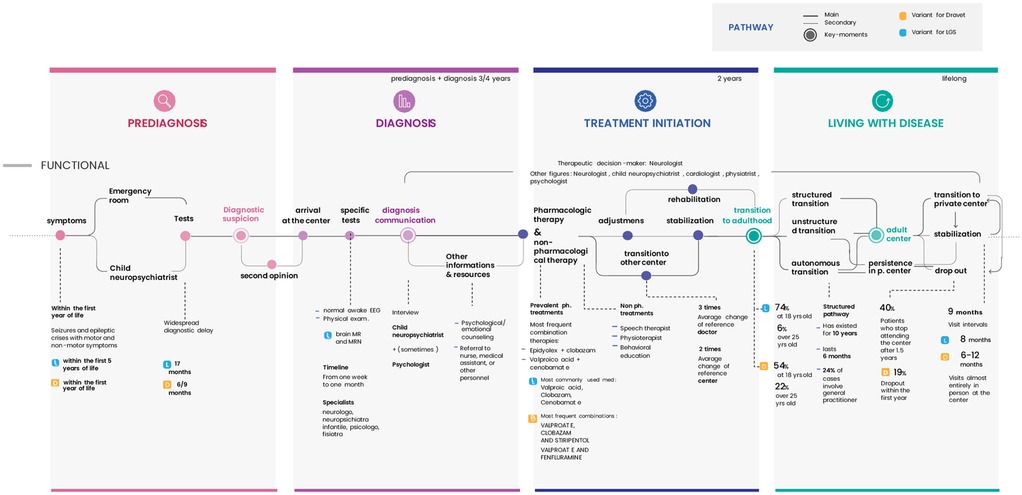 The collected data allowed for the reconstruction of a comparative Patient Journey between DS and DEEs/LGS patients (Figure 4), structured into four key phases: pre-diagnosis, diagnosis, treatment initiation, and long-term management. This visual representation provides a concise overview of the complex steps patients and their families must navigate.