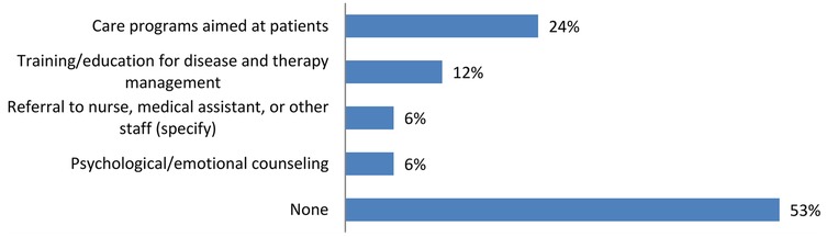Horizontal bar chart showing percentages of healthcare services provided. Care programs aimed at patients: 24 percent; training/education for medical management: 12 percent; referrals and psychological counseling both at 6 percent; none at 53 percent.