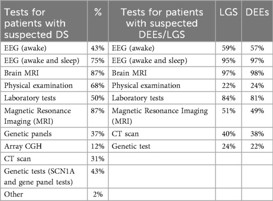 Table 1 and 2. Comparison of diagnostic tests performed on suspected DEEs/LGS patients (right) vs. DS patients (left), based on physician reports.
