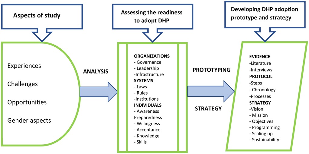 Methods: This was a qualitative study based on a literature review, key informant interviews, in-depth interviews and a thematic analysis. Forty-nine interviews were carried out with participants consisting of CHWs, MNOs, managers/supervisors, and payers. A thematic analysis provided information on the readiness for DHP at individual, institutional and national levels. A protocol and strategy for adoption were imputed from the data.