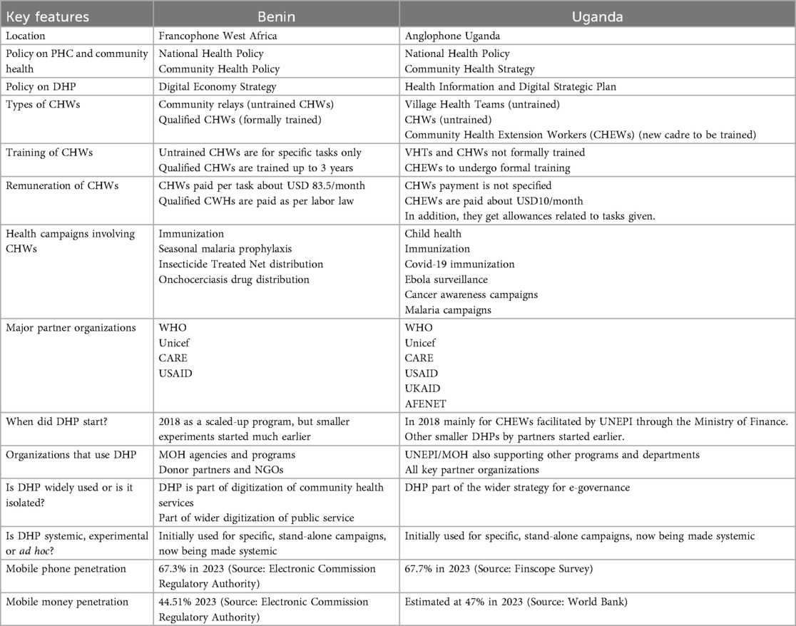 Conclusion: Although Benin and Uganda are at relatively different levels of readiness to adopt DHP, both countries reported similar experiences. Both countries have embraced DHP with positive policies, but major challenges remain in systems, digital knowledge and infrastructure. The two countries are transitioning to digital economy, which requires integration, interoperability and digitization of PHC and DHP. Common and harmonized systems for PHC financing need to be set up. As a major workforce in PHC, a deliberate effort is needed to improve CHWs motivation and performance through commensurate, safe and timely payments. Each country should design a manual to guide the adoption and operationalization of DHPs nationwide.