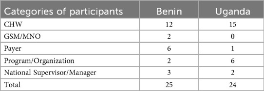 While CHWs provided in-depth information about DHP, other categories of respondents provided information to mitigate against CHWs' possible recall bias. These were supervisors, managers, payers, and GSM/MNO operators. In addition, these categories of participants provided other specialized information which only they could provide. Altogether 49 interviews were held. These 49 participants were selected as follows: at least one CHW from each location, at least one GSM/MNO manager from each country, at least one payer from each of the different organizations or programs, and at least one national supervisor or manager. Table 2 below shows the different categories of participants interviewed.