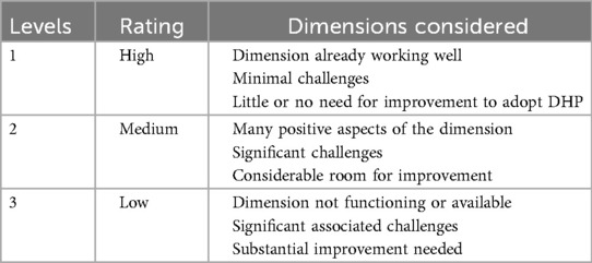 Researchers rated readiness as high, medium or low, based on the level of perceived performance, the level of need for improvement, and severity of challenges. High readiness was when a dimension was functioning well, with little to no need for improvement. Medium readiness was when positive aspects were identified, but with room for improvement. Low readiness was when significant challenges were present, requiring substantial improvement. See Table 3. Based on the findings, a framework was made to help plan how to transform current DHP practices into a national, inclusive and sustainable digital payment systems.
