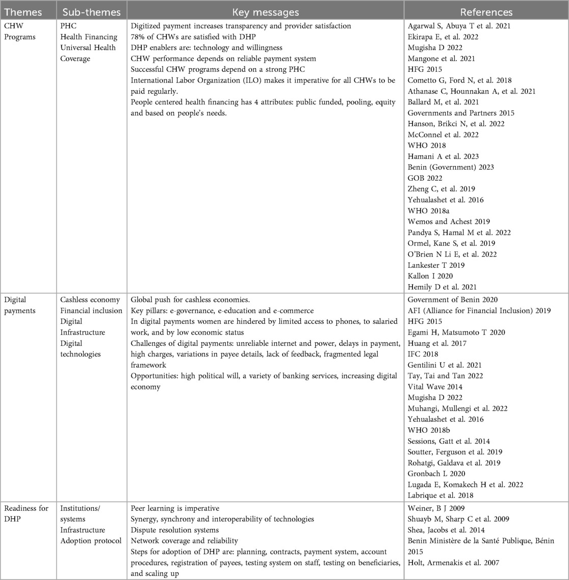 Table 4 presents a synthesis of key findings and references from literature. DHP was mentioned under five themes: primary health care (PHC), CHWs, health financing, digital economy, gender and digital payments, readiness for DHP and DHP systems.
