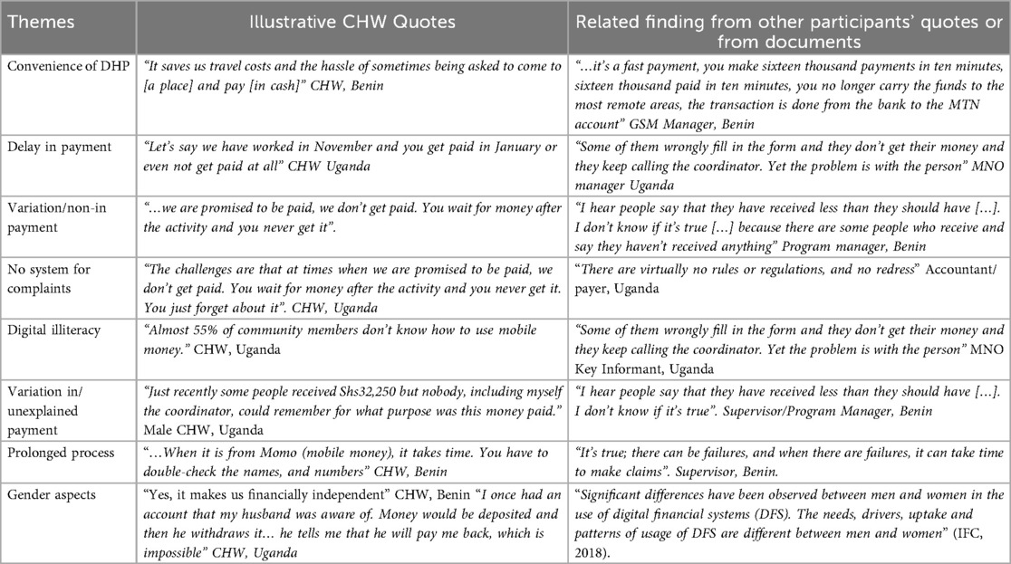 The study documents users' perspectives as well as their expected and real experiences. Data from Benin and Uganda enabled us to understand that mobile payment for CHWs and other front-line workers is essentially implemented by the Ministry of Health through other players in the expenditure chain. The main impetus for DHPs came from immunization programs because of their intensity and national spread. Initially, DHP started as an experiment and it is now a learning process. Since its adoption in immunization campaigns, good practices have been developed by the players to tackle challenges. However, no concrete protocols have as yet been developed. The results of DHP have largely been positive: beneficiaries' and managers' satisfaction, reduced risk of handling cash, ease of payment and saving on staff costs, among others.