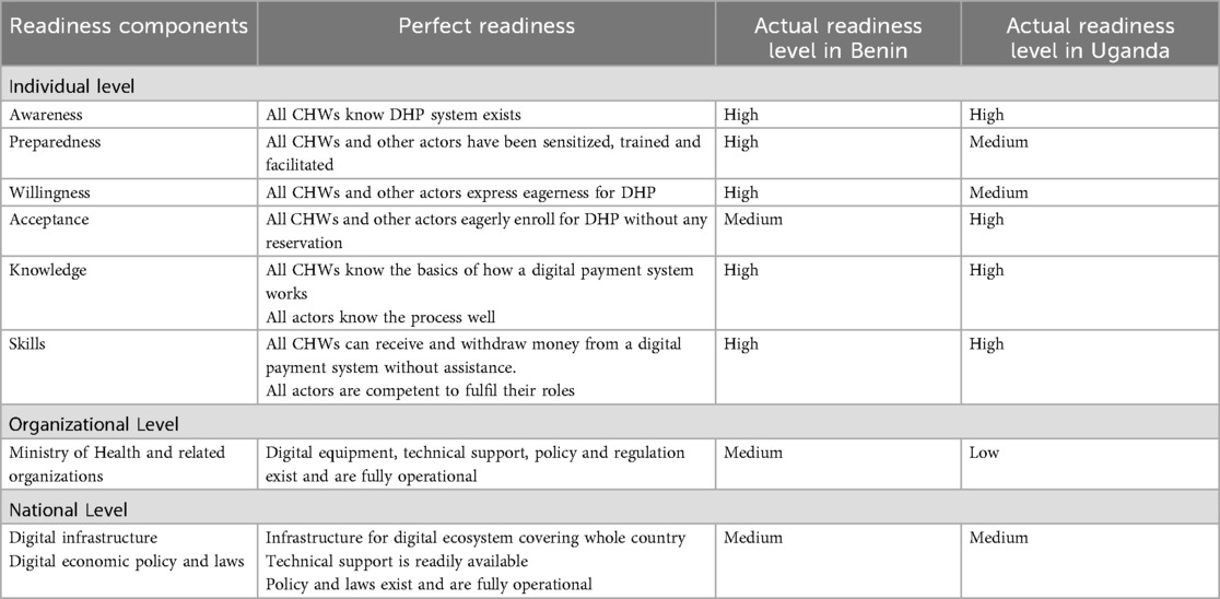 The key research question is: how ready are Benin and Uganda to adopt digital payment of health workers? And what are the implications for adopting DHP? Therefore, the aim of this study was to assess nationwide readiness to adopt digital payment systems for CHWs and other frontline workers. The study objectives were to understand the experiences of CHWs and payers of DHP, to assess readiness to adopt digital payment systems nationwide, and to design a protocol and strategy to adopt digital payment systems for CHWs and other frontline workers.